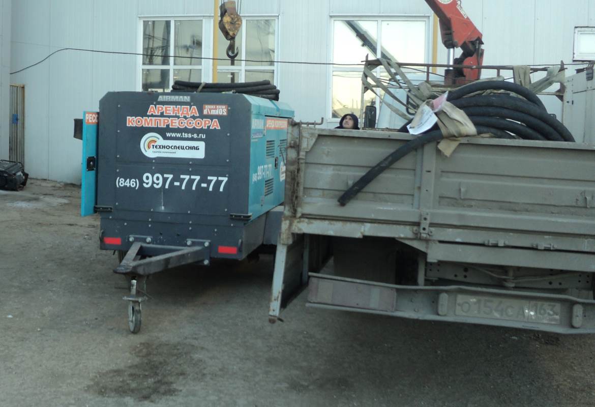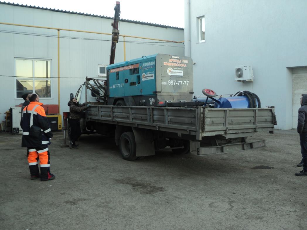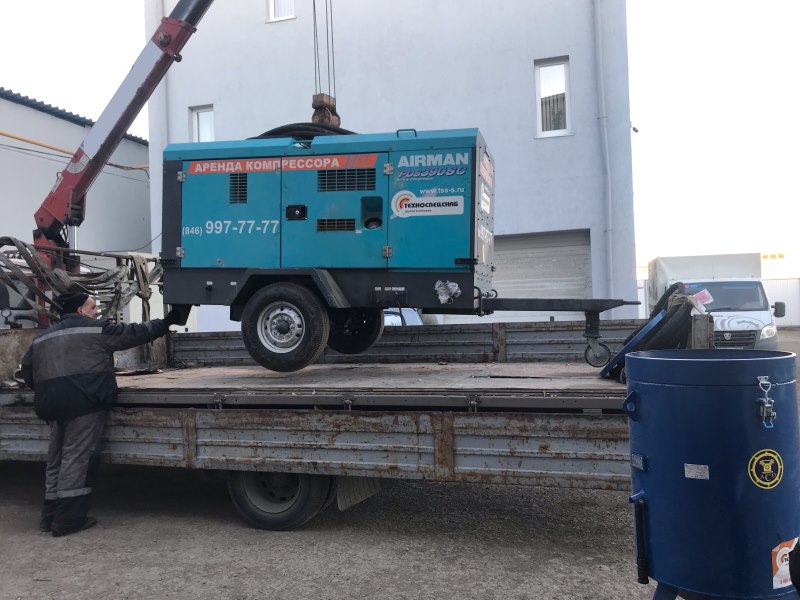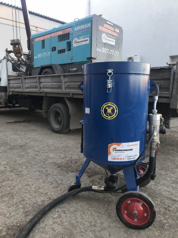 Для пескоструйных работ предоставлен в аренду компрессор AIRMAN PDS 390, также клиент взял в аренду пескоструйный аппарат АСО-200.